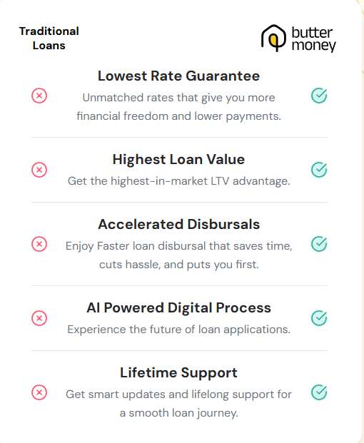 Butter Money offers a 100% digital, personalized, and transparent experience. We leverage AI technology to provide faster approvals, better rates, and a seamless application process. Our platform eliminates paperwork hassles and provides real-time updates on your application status.